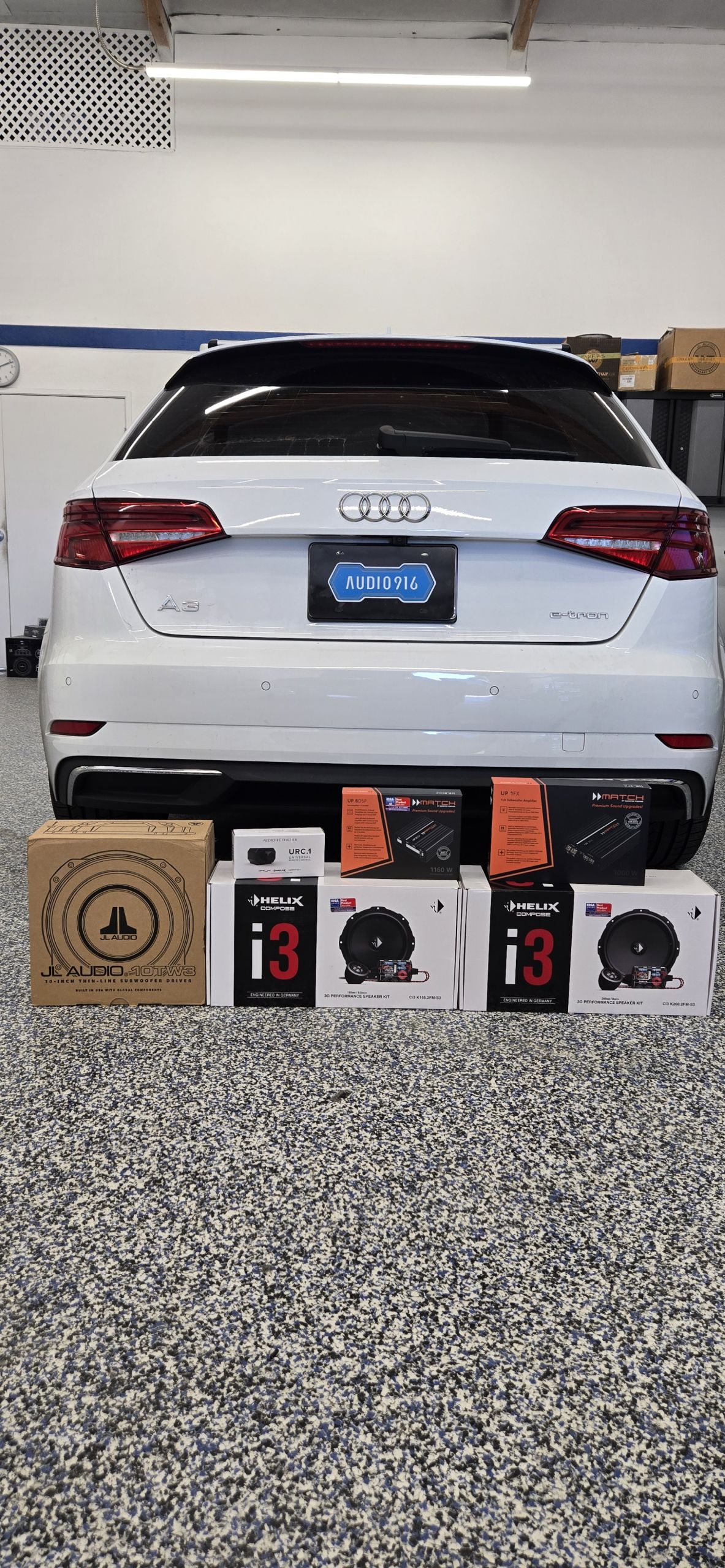 A customer came to us with this 2017 Audi e-tron not thrilled with the sound from his standard audio system. We started with an Audiotec-Fischer Match UP 6DSP 6-channel amplifier with build in DSP. For mids and highs we went with the Helix Compose i3 components in the front doors which include a direct bolt in 8" midbass driver and tweeter. For the rears we went once again with the Helix Compose i3 6.5" component set. To handle the lows we went with a JL Audio 12TW3 shallow mount subwoofer mounted in a custom fiberglass enclosure. Powering the subwoofer is an Audiotec-Fischer Match UP 1FX mono amplifier. Once the system was properly tuned the vehicle was delivered to the customer who was absolutely BLOWN away by the sound quality.